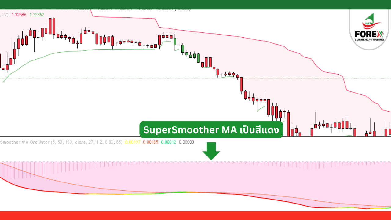 • SuperSmoother MA Oscillator มีการตัดลง ฮิสโตแกรมเป็นสีแดง แสดงว่าตลาดอยู่ในแนวโน้มขาลง