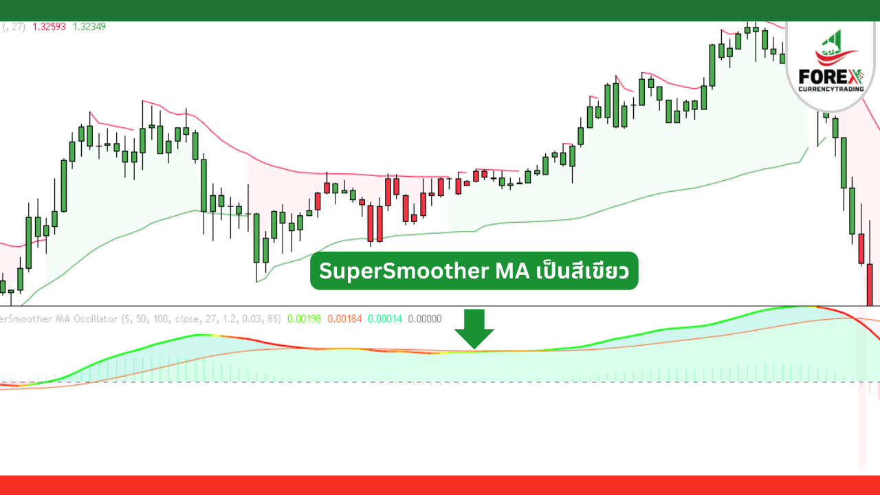 • SuperSmoother MA Oscillator มีการตัดขึ้น ฮิสโตแกรมเป็นสีเขียว แสดงว่าตลาดอยู่ในแนวโน้มขาขึ้น