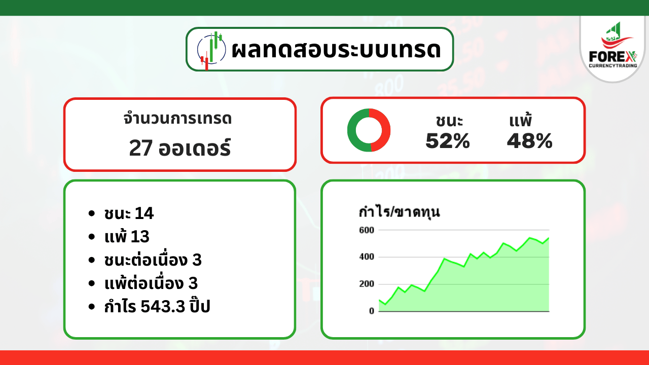 • ระบบเทรดนี้ได้ทำการทดสอบในช่วงเวลาตลาดของคู่เงินที่เทรดทำให้ได้ผลลัพธ์ที่ดี และได้มีการจำกัดระยะ Stop Loss สูงสุดไว้ที่ 50 ปิ๊ป