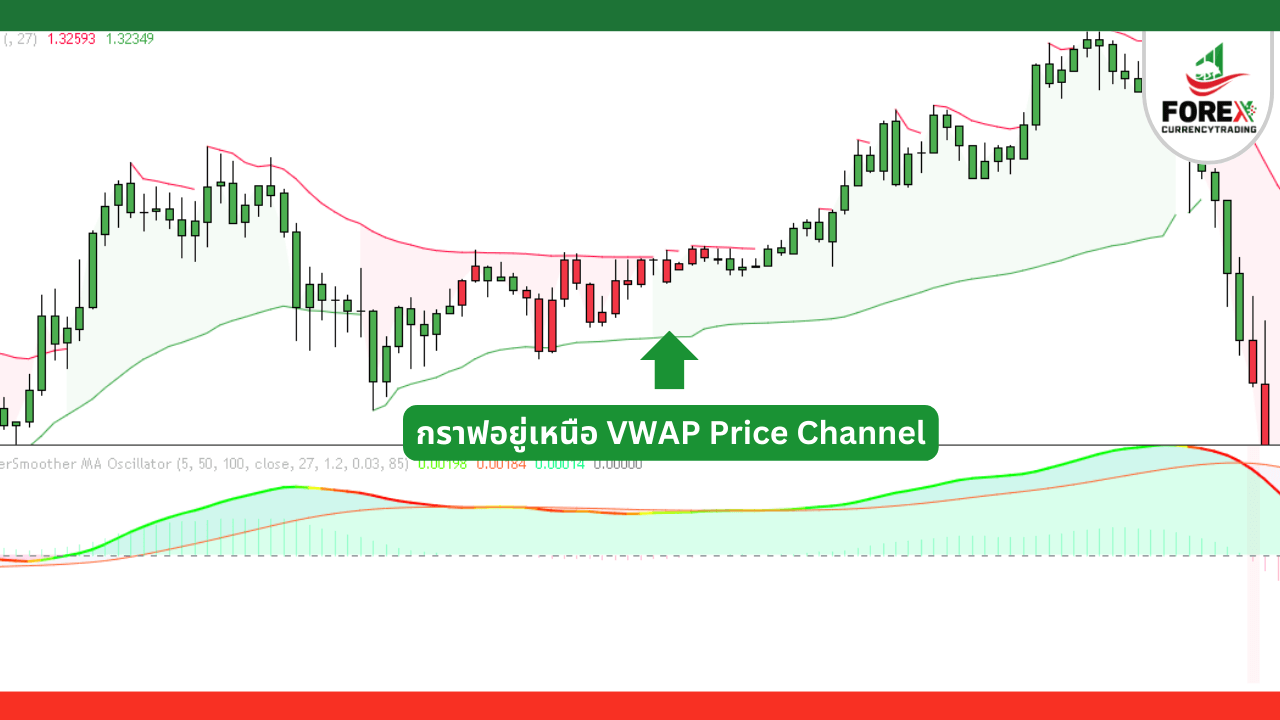 1. ราคาอยู่เหนือ VWAP Price Channel และมีเส้นเป็นสีเขียว