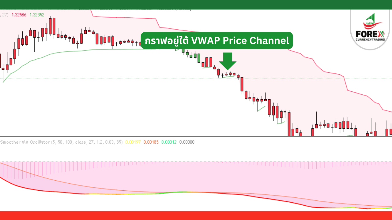 • VWAP Price Channel เป็นเส้นสีแดงและอยู่เหนือกราฟราคาแสดงว่าราคากำลังอยู่ในแนวโน้มขาลง